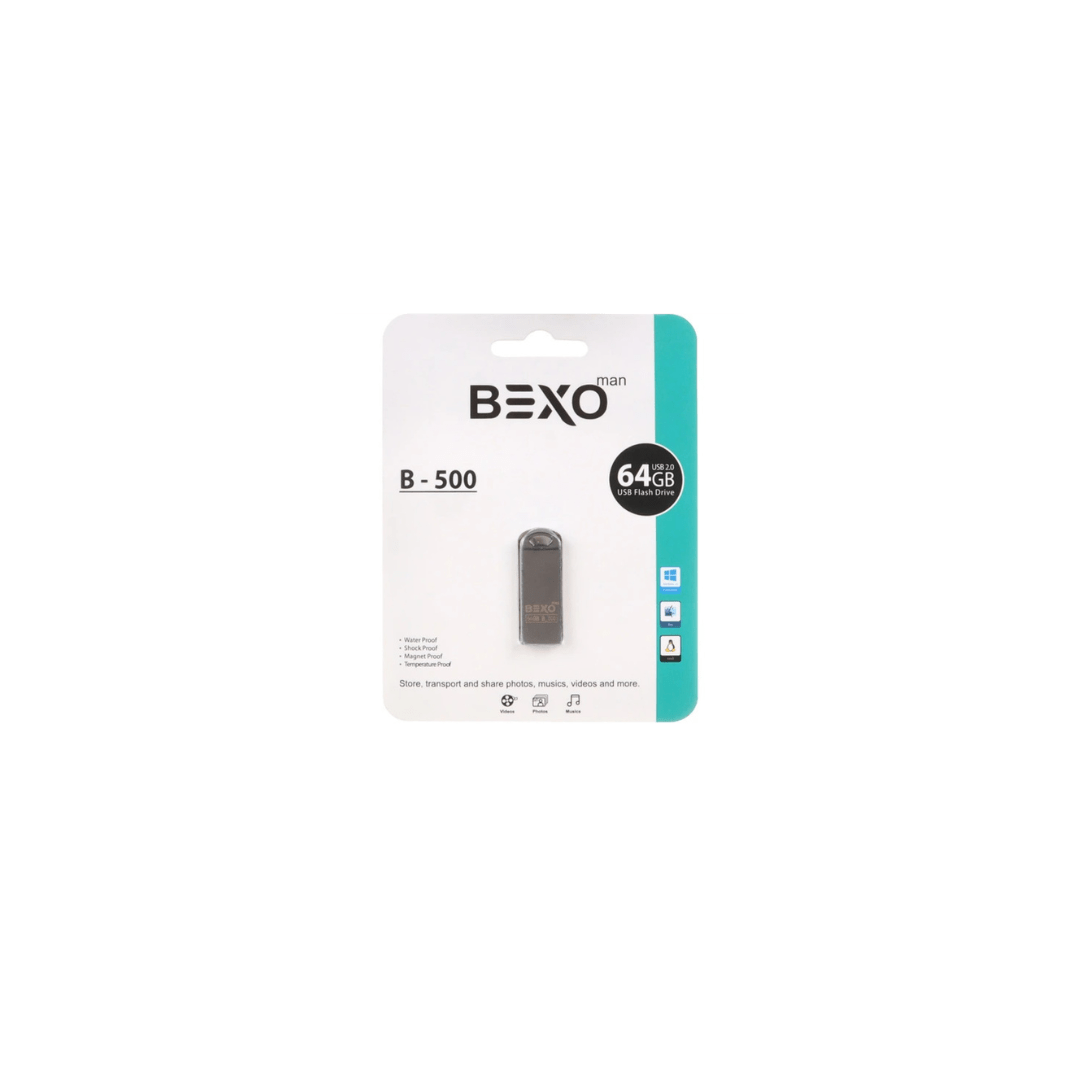 فلش مموری USB 2.0 BEXO مدل B-500 با ظرفیت 64 گیگابایت، گارانتی مادام تسویه دار و سازگاری کامل با ویندوز، مک و لینوکس. ایده‌آل برای دانشجویان، کاربران خانگی و کاربردهای روزمره با طراحی مقاوم و قابلیت اتصال Plug & Play.